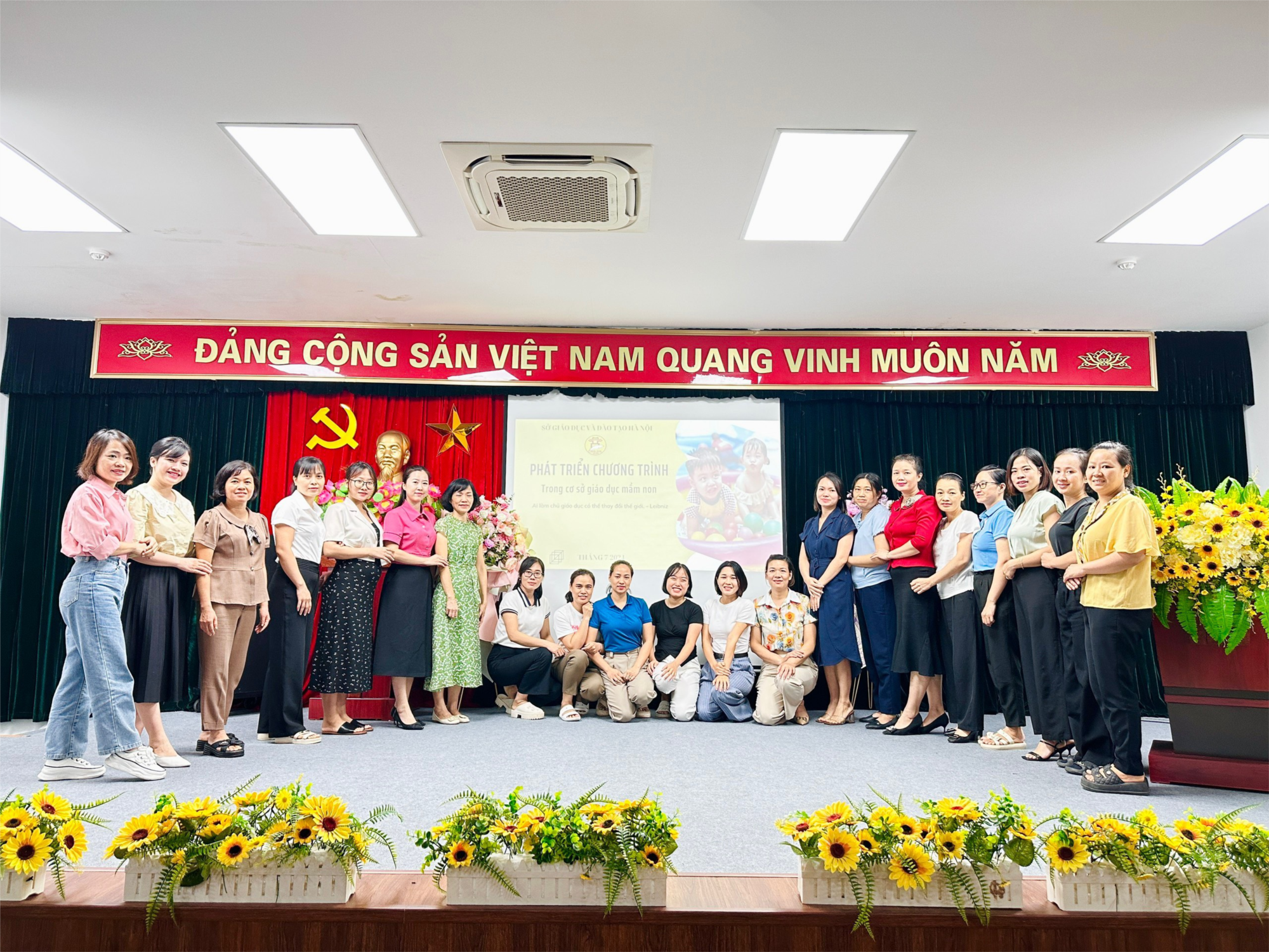 Về dự và trực tiếp làm báo cáo viên tại lớp học có đồng chí Nguyễn Hoài Hương – Chuyên viên Phòng Mầm non Sở GD&ĐT Hà Nội. Tại buổi tập huấn, giáo viên đã được đ/c Nguyễn Hoài Hương chia sẻ và hướng dẫn những nội dung cụ thể. Buổi tập huấn diễn ra trong không khí say mê và hứng thú. Giáo viên tham gia buổi tập huấn đều hăng hái tham gia thảo luận, mạnh dạn chia sẻ ý tưởng, băn khoăn của mình về nội dung chương trình tập huấn. Điều này đã giúp cho giáo viên hiểu rõ hơn về :