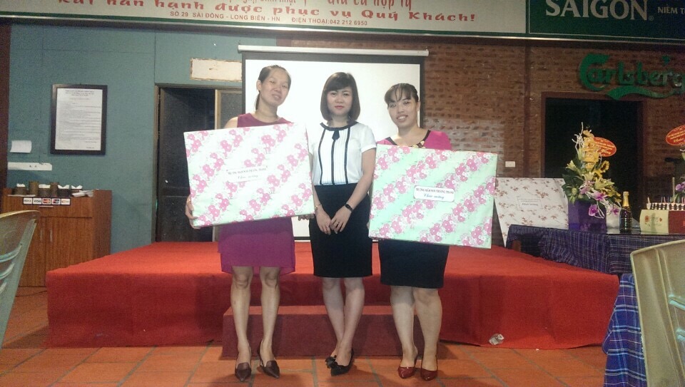 Đ/c Phạm Lệ Hà và Nguyễn Thị Thu Hường tặng quà kỉ niệm cho nhà trường.