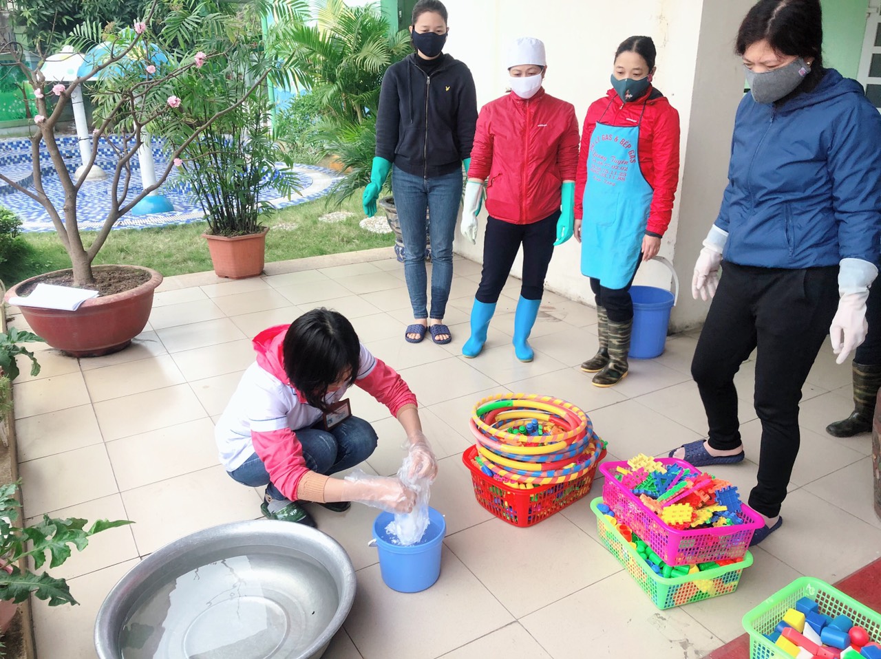Ngoài việc giám sát, hiệu trưởng các nhà trường cùng các cô giáo, nhân viên của trường tham gia vệ sinh, lau, khử trùng Cloramin B đồ chơi, các phòng học, một số phòng chức năng, khu vực sân chơi…